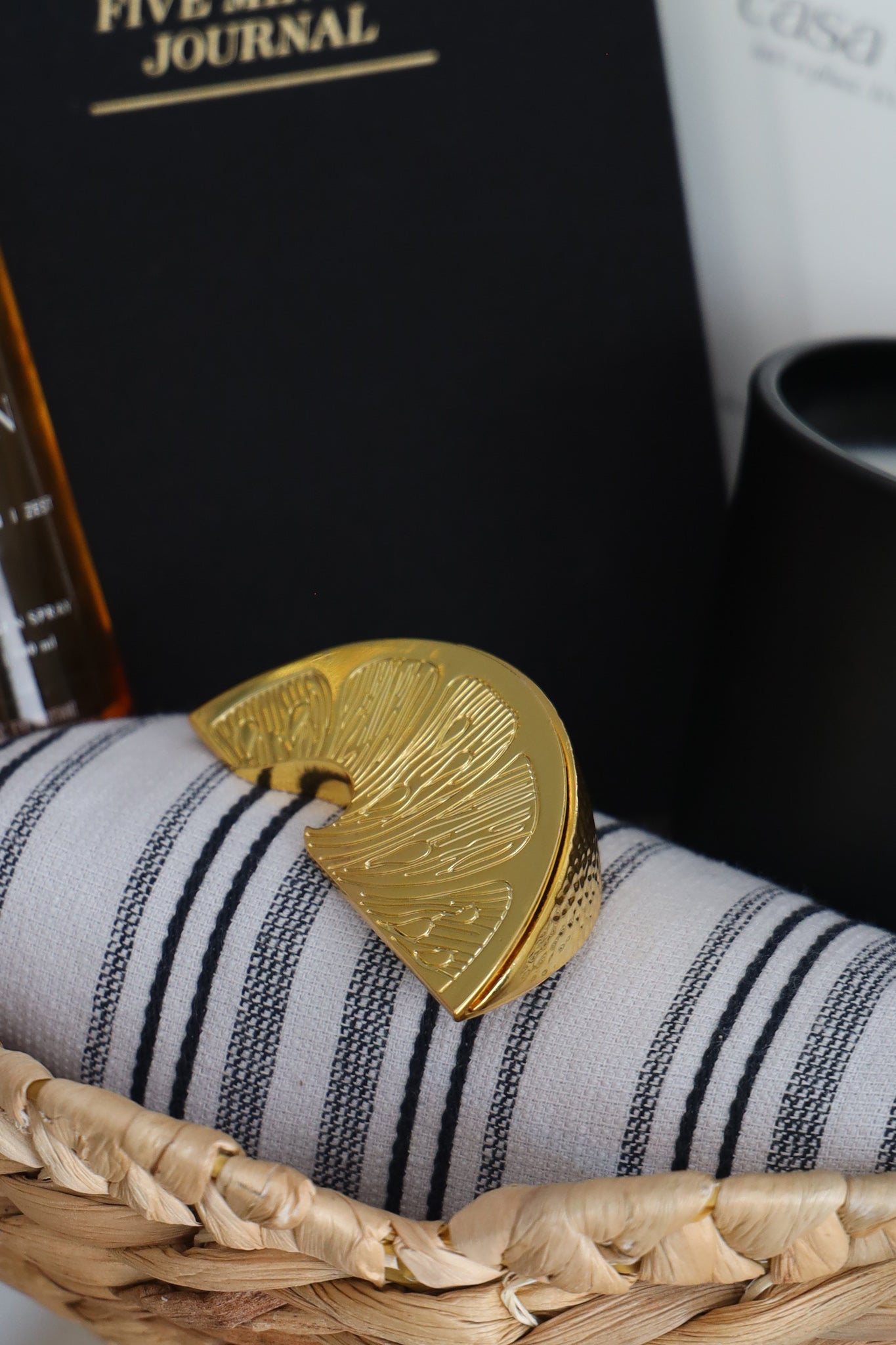 Artful form meets everyday function. The Citrus Curve is a sculptural gold lemon opener designed to elevate your kitchen or bar setup. With etched detailing inspired by the folds of citrus peels, it opens lemons or other small citrus fruits with ease—while doubling as a conversation-starting accent piece.