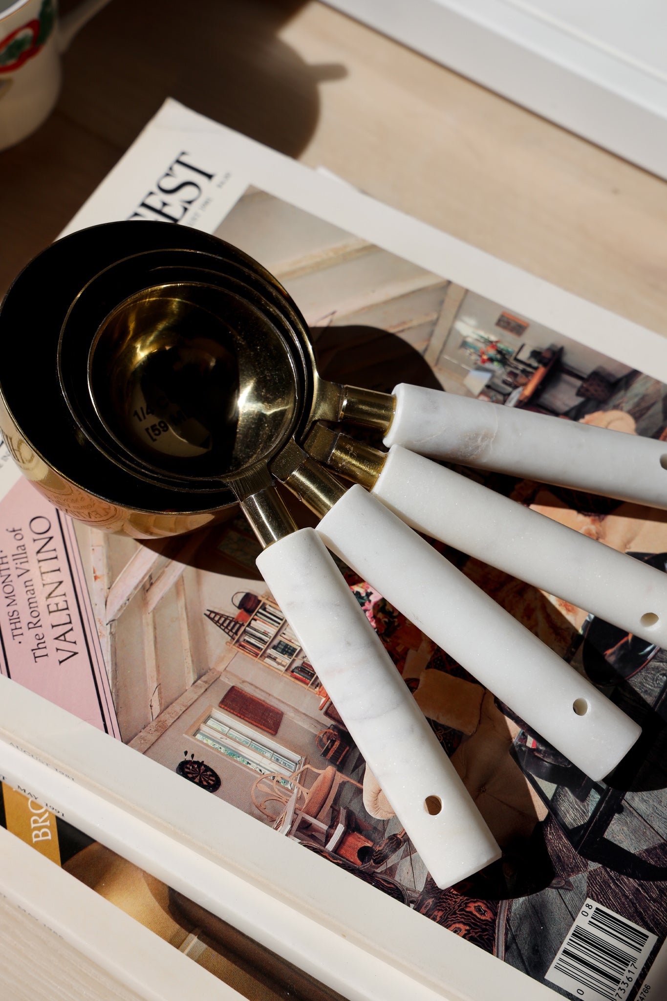 Elevate your everyday baking and cooking with this stunning set of gold metal measuring cups featuring smooth marble handles. Designed to blend beauty with function, each cup has a sleek gold finish and a weighted marble handle that feels elegant and substantial in the hand.